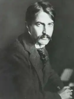After staying in Limpsfield, Surrey, for a few days, Crane and Taylor settled in Ravensbrook, a plain brick villa in Oxted.[130] Referring to themselves as Mr. and Mrs. Crane, the couple lived openly in England, but Crane concealed the relationship from friends and family in the United States.[131] Admired in England, Crane thought himself attacked back home: "There seem so many of them in America who want to kill, bury and forget me purely out of unkindness and envy and—my unworthiness, if you choose", he wrote.[132] Velestino the dog sickened and died soon after their arrival in England, on August 1. Crane, who had a great love for dogs,[133] wrote an emotional letter to a friend an hour after the dog's death, stating that "for eleven days we fought death for him, thinking nothing of anything but his life."[134] The Limpsfield-Oxted area was home to members of the socialist Fabian Society and a magnet for writers such as Edmund Gosse, Ford Madox Ford and Edward Garnett. Crane also met the Polish-born novelist Joseph Conrad in October 1897, with whom he would have what Crane called a "warm and endless friendship".[135]