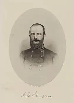At the start of the Peninsula Campaign in 1862, Ramseur commanded artillery in Brig. Gen. John B. Magruder's division, but he was elected colonel of the 49th North Carolina Infantry on April 12, 1862. In the Seven Days Battles, Ramseur saw his first significant action at the Battle of Malvern Hill, where he led a futile charge against the strong Union defense and was severely wounded in the right arm. The arm mangled and paralyzed, Ramseur returned home to recuperate. After the Battle of Antietam, he returned from leave as commander of a brigade of four North Carolina regiments in Brig. Gen. Robert E. Rodes's division of Lt. Gen. Thomas J. "Stonewall" Jackson's corps. Promoted to brigadier general on November 1, 1862, he became, at 25 years old, the youngest general in the Confederate army at that time.[2] This was a remarkable accession to rank for someone who had missed so many battles, but Gen. Robert E. Lee had been very impressed by Ramseur's aggressive performance at Malvern Hill.