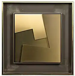 Edlich used paper in his early collages and both golden-hued Muntz metal and white Everdur Silicon Bronze in his reliefs.[11] An early reviewer noted that the reliefs had "straight-edge severity ameliorated by the color and sheen of the metals, changing according to the light."[11]