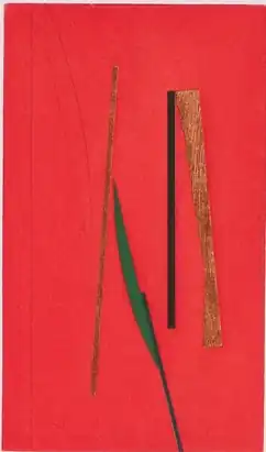 Edlich made works on paper and canvas as well as free-standing and relief sculptures. Early in his career he made serigraph prints[8] and later made etchings, as, for example, "Reflections on a Season's Landscape" of 1981, shown here.[11][27] He made cut-paper and mixed media collages on paper or canvas.[23][28] He sculpted using Acrylite cast sheets[9] and made framed reliefs using thin sheets of lacquered bronze.[11][10]