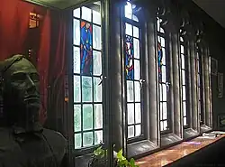 The left wing, composed of the pavilion of the Foster Shrine, is entered from the left of the building's foyer, which serves as the lobby of the Charity Randall Theatre, and through an entrance corridor that features Foster artifacts, a Foster bust, and five small casement windows featuring Connick stained glass windows devoted to symbols of Stephen Foster and his songs.[19] Moving along the corridor to the shrine, on the right is the entrance to the Foster Reading Room and library, which is home to much of the Foster collection, including its more fragile contents, that can be examined by appointment. Continuing on, the corridor opens into a 12-sided gothic chamber with lancet windows containing Connick stained glass medallions which illustrate various Foster songs.[15] On display in the Shrine in and around Gothic-arched alcoves are Foster's piano, sheet music, broadsides, recordings, and other personal items and memorabilia.[20] The 2003 renovation left the memorial shrine untouched, except for the addition of an unobtrusive fire suppression systems.[15]