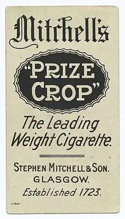 The Imperial Tobacco Company (Great Britain and Ireland) Ltd. was created in December 1901 through the amalgamation of 13 British tobacco and cigarette manufacturing companies which were being threatened by competition from the American Tobacco Company: initially W. D. & H. O. Wills of Bristol merged with Stephen Mitchell & Son and, subsequently, other smaller companies joined in the amalgamation.[26] However, Stephen Mitchell & Son continued to trade under its own name and retained responsibility for its own manufacturing and selling until well into the 20th century.[4]