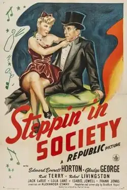 Steppin' in Society is a 1945 American comedy film directed by Alexander Esway, written by Bradford Ropes, and starring Edward Everett Horton, Gladys George, Ruth Terry, Robert Livingston, Jack La Rue and Lola Lane. It was released on July 9, 1945, by Republic Pictures.[1][2][3]