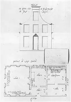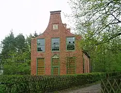 The 17th century brick houses in Amsterdam's Noortse Bosch weaving district and the simple bell gables of Zaandam, as well as the simpler town houses in Leiden and Haarlem, probably served as models for the Dutch houses in Potsdam.[9][10] As the Stern hunting lodge with the same architecture was completed shortly before construction of the first houses in the Dutch Quarter began, it is reasonable to assume that it served as a model house for the always economically minded Soldier King in order to better estimate the construction time and costs for the larger project. The name of the architect is not certain; it is possible that the house was built according to a plan obtained directly from Holland.[11] The contract for the construction was probably awarded to the grenadier and master carpenter Cornelius van den Bosch (1679–1741) from Schipluiden near Delft,[12] other sources mention Schipley near Grafenhaag (The Hague),[13] who came to Potsdam around 1720. The first mention of the Dutchman can be found in a rank roll (list of names) dated 1726 as a "long fellow" in the Royal Regiment of Foot.[14] Like the soldiers of the time, he also pursued a civilian profession after his daily military service and is mentioned in the construction files for the hunting lodge in connection with the ordering of timber. The French-born captain of the Corps of Engineers and court architect Pierre de Gayette supervised the construction, as evidenced by his signature under brick deliveries "for the new house in the royal par force garden" in August/September 1730.[10]