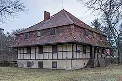 Slightly offset from the center of the star, between two rays, the Soldier King had a hunting lodge built between 1730 and 1732 in the style of a simple Dutch town house, which he named after the location. From the following year onwards, he had the Dutch Quarter in Potsdam built from a large number of similar houses. In addition to the extension to his hunting lodge in Königs Wusterhausen, the small hunting lodge Stern was the only new building that the soldier king, who was very frugal, had built for himself. The half-timbered house a few meters to the southwest was probably built at the same time as the hunting lodge and housed the castellan, who was also granted bar rights. The castellan's house was used for catering until 1992. The farm buildings included a stable building in the north-east, completed in 1733, in which at least 18 horses could be stabled. It has been used for residential purposes since a conversion around 1930.[2] A barn with a small stable, a wash house with a privy and a well in the center of the star are no longer preserved. The structural remains of a brick oven were uncovered between 2006 and 2009 and rebuilt in 2011/2012 in accordance with the preservation order.[3]