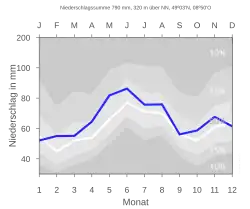 The climate of Sternenfels is generally mild due to the influence of the neighboring Kraichgau hills. The castle hill, with a height of about 400 m (1,300 ft), allows portions of Sternenfels to overlook the neighboring Kraichgau.[9] The major rain storms generally happen earlier in the year than in the rest of the region, though this helps the local vineyards. Generally the local soil is comparatively poor and is mainly used for forestry.