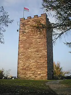 Sternenfels has a long industrial history. The local quarries were used to produce masonry and "stubensand", an early abrasive which was very popular for household cleaning in the 18th and 19th centuries. The town castle, built by the von Kürnbach family and later used by the von Sternenfels, was completely demolished and used to produce stubensand by 1778. In 1866 an observation tower was built and triggered local tourism.[9] Sternenfels image was coined by the "sandbauern", farmers that produced stubensand and wove baskets besides farming. The intensive stubensand production led to damages in the local forests and ongoing conflicts between the community and the sandbauern, which were entitled to excavate stubensandstone in the local forests.[15] The last sand mill was closed in 1935, however sandbauern costumes are still worn sometimes and the sandbauern image is used to promote the village.[15] The site of the castle is still visible in the center of the village. The 14 m high Water tower on the former castle hill was built during 1967 as part of the Lake of Constance Water supply system and styled as a keep. The tower is open for the public and allows an excellent view both over Kraichgau and Stromberg. It includes as well an historic exhibition about the local nobility and geology.