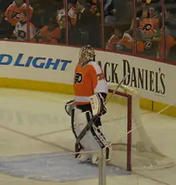 Mason was traded on April 3, 2013, to the Philadelphia Flyers for goaltender Michael Leighton and a 2015 third round draft pick.[14] On April 8, Mason signed a one-year contract extension worth $1.5 million.[15] Mason had four wins and two losses in Philadelphia and posted an impressive 1.90 GAA and a .944 save percentage, leading to speculation that Mason would replace Ilya Bryzgalov as the starter for Philadelphia.[16] In the off-season, on June 25, 2013, Bryzgalov was bought out by the Flyers,[17] where the team subsequently signed goaltender Ray Emery, effectively promoting Mason to the starter's role.[18] On November 12, 2013, Mason recorded his first shutout for Philadelphia against the Ottawa Senators in a 5–0 win.[19] On January 18, 2014, Mason signed a three-year contract extension with the Flyers worth $12.3 million for an annual average of $4.1 million.[20] Mason finished the 2013-14 season with a 33-18-7 record and a .917 save percentage, which was enough to bring the Flyers to the playoffs. In the playoffs, Mason started 4 games and played in 5, going 2-2 with a 1.97 GAA and a .939 save percentage, but the Flyers were eliminated by the New York Rangers in 7 games.