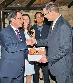 ![]() Steven Lett (right) receiving traditional gifts from Cypriot President Nicos Anastasiades at an official dinner on the occasion of Cospas-Sarsat meetings in Limassol, Cyprus, 14 June 2013 | |