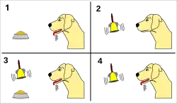 In the theory of classical conditioning, unconditioned stimulus (US) is a stimulus that unconditionally triggers an unconditioned response (UR), while conditioned stimulus (CS) is an originally irrelevant stimulus that triggers a conditioned response (CR). Ivan Pavlov's dog experiment is a well-known experiment that illustrates these terms. The unconditioned stimulus is the dog's food that would naturally cause salivation, which is an unconditioned response. Pavlov then trained the dog by ringing the bell every time before food. The conditioned stimulus is the ringing bell after training, which causes salivation as a conditioned response.[3]