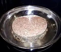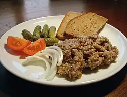 Stippgrütze, also called Wurstebrei, is a German dish from Westphalia which is similar to Grützwurst or Knipp. It consists of barley groats cooked in sausage juices (Wurstbrühe), which are enriched with pieces of meat, offal, such as heart, kidney or liver and seasoned with spices and salt. More rarely, finely chopped onions are added. The cooked ingredients are minced after the juices have been poured off and a crumbly cake is left which is held together with fat and which sets on cooling. There are various recipes, but they all contain barley groats, fat and meat.