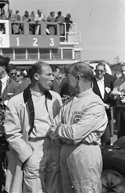 Moss's first World Championship victory came at the 1955 British Grand Prix, a race he was also the first British driver to win.[25] Leading a 1–2–3–4 finish for Mercedes, it was the first time he had beaten Fangio, his teammate, rival, friend and mentor. It has been suggested that Fangio allowed Moss to win in front of his home crowd. Moss himself asked Fangio this repeatedly, and Fangio would always reply with: "No. You were just better than me that day."[26] The same year, Moss also won the RAC Tourist Trophy,[27] the Targa Florio (with Peter Collins),[28] and the Mille Miglia.[29]