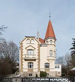 • Bahnstraße 36: country home in modern-baroque-style with attic, oriel like structures and spire lights by A. von Schorn 1910.