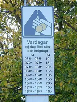 The Stockholm congestion tax (Swedish: Trängselskatt i Stockholm), also referred to as the Stockholm congestion charge, is a congestion pricing system implemented as a tax levied on most vehicles entering and exiting central Stockholm, Sweden.[1] The congestion tax was implemented on a permanent basis on 1 August 2007,[2][3] after a seven-month trial period between 3 January 2006 and 31 July 2006.[4] It was inspired by Singapore's Electronic Road Pricing (ERP) system, which was first introduced as the Area Licensing Scheme in 1975.