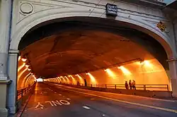 Final plans for the tunnel were filed by city engineer Marsden Manson in March 1912.[4] By June 1912, the final legal and funding issues were being resolved, and work was to start "within 30 or 60 days."[11] In July 1913, excavation of the bore was planned to take 100 days.[12] During construction, hotel guests were kept awake by work at night[13] and at least one worker was killed by a cave-in.[14] Revenue service through the tunnel was inaugurated by Mayor James Rolph on December 29, 1914.[5]