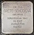 Grete Schücková née Kannová was born in Teplice on 8 April 1896.[38] Her parents were Adolf Kann and Bedřiška (Frederika) Kannová. Grete had four siblings: Erwin, Gerrtud, Edith and Herbert. She married Josef Schück. Prior to deportation, she was registered in Prague. On 30 July 1942, she was deported to Theresienstadt concentration camp with transport AAc (her number on this transport was the 910). On 20 August 1942 she was deported to Riga with transport Bb (her number on the transport was 376). Grete Schücková was murdered by the Nazi regime in the course of the Shoah.[39]