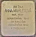 Anna Mahlerová was born on 4 December 1851 in Pravonin. From 1929 to 1938, she lived with her son in Podbořany. On 3 October 1938, during the Nazi occupation of Sudetenland, she fled to Říčany. Thereafter, she lived with her granddaughter, Kamila Fišerová (see above) and her family. Together, with most of the family members, she was arrested and deported on 10 August 1942 from Prague to Theresienstadt concentration camp by transport Ba. Her transport number was 1374. In the same year, on 19 October 1942, she was deported from Theresienstadt to Treblinka extermination camp with transport Bw. Her transport number was 998. There she was murdered by the Nazi regime.[14][15]