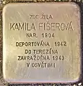 KAMILA FIŠEROVÀ BORN 1904 DEPORTED 1942 TO THERESIENSTADT MURDERED 6.9.1943 IN AUSCHWITZ |