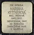 MARIANA KETTNER NÉE PICKOVÁ BORN 1901 DEPORTED 1942 TO THERESIENSTADT MURDERED 1943 IN AUSCHWITZ |