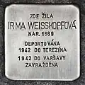 Weisskopfovà, IrmaIrma Weisskopfovà was born on 20 October 1889. She was married to Karel Weisskopf, the couple had three children. On 18 April 1942 she and her husband were deported from České Budějovice to Theresienstadt concentration camp by transport AK/B, Nr. 820 and 821. Afterwards, on 26 April they were both transferred by transport An, Nr. 967 and 968, to Warsaw ghetto, where they were murdered.[13]