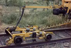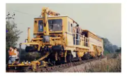 A stoneblower is a railway track maintenance machine that automatically lifts and packs the sleepers with small grade ballast, which is blown under the sleepers to level the track.[1][2] An alternative to the use of a ballast tamper, the totally self-contained machine levels track without the use of a large gang of workmen.