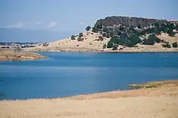 Black Butte Lake, formed by Black Butte Dam in Tehama County, is the largest reservoir on Stony Creek, covering more than 4,000 acres (1,600 ha) in the lower Coast Range foothills. A second tributary called North Fork Stony Creek joins in the reservoir from the west.[14] Downstream of Black Butte Dam surface water from Stony Creek is diverted into the Stony Creek Canal and other smaller ditches for irrigation.[15] The creek re-enters Glenn County, flowing in an east-southeast direction across the Sacramento Valley as a wide meandering stream.[16] North of Orland, the largest town in the watershed, it is crossed by Interstate 5.[17] It joins the Sacramento River south of Hamilton City and west of Chico at Sacramento river mile 190 (kilometer 306).[18]