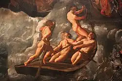 It was initially commissioned from Giovanni Mansueti, but it was transferred to Palma after Mansueti's death in 1527 - Palma was a member of the scuola from 1513 to 1528. Giorgio Vasari misattributed it to Giorgione,[1] but later attributed it to Palma, though he probably left it unfinished on his death, with Bordon painting the boat.[3]