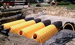 Underground stormwater detention allows for high volume storage of runoff in a small footprint area. The storage vessels can be made from a variety of materials, including corrugated metal pipe, aluminum, steel, plastic, fiberglass, pre-cast or poured-in-place concrete.[3]