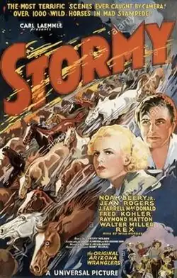 Stormy is a 1935 American western drama film directed by Lew Landers, written by Ben Grauman Kohn and George H. Plympton, and starring Noah Beery, Jr., Jean Rogers, J. Farrell MacDonald, Raymond Hatton, Walter Miller and Fred Kohler.[1][2][3] It was released on October 22, 1935, by Universal Pictures.