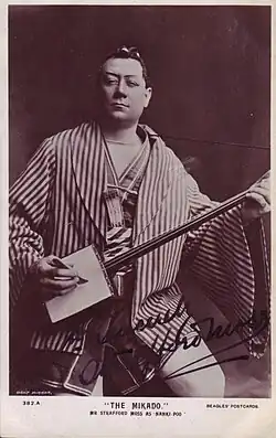 In 1905, the D'Oyly Carte company was performing only on tour. Moss was promoted to the leading roles of Nanki-Poo in The Mikado, Colonel Fairfax in Yeomen and Marco in The Gondoliers.[5] From December 1906 to February 1907 he assumed more leading roles, Ralph Rackstraw in H.M.S. Pinafore, Frederic in The Pirates of Penzance, the Duke of Dunstable in Patience, Tolloller in Iolanthe and Cyril in Princess Ida, in addition to Nanki-Poo, Fairfax and Marco in The Gondoliers. In 1906 he toured South Africa with the D'Oyly Carte company.[8] Moss appeared as Marco at the Savoy Theatre in the company's First London Repertory Season 1907[5] and from July 1907 he was again touring as principal tenor, sharing the role of Defendant and also playing Ralph, Frederic, the Duke,[9] Tolloller, Cyril, Nanki-Poo, Fairfax and Marco.[5] In April 1908 the Company returned to the Savoy Theatre for its Second London Repertory Season, opening with Moss as Nanki-Poo from April to May 1908. From July to October 1908 he appeared as Griffith David in another companion piece, A Welsh Sunset,[10][11] and stood in as Nanki-Poo and Ralph several times in September and October that year.[5]
