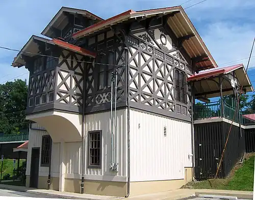From 1873 to 1883, the building served as the railway station for Wayne, Pennsylvania. In 1883, the building was moved to its current location in Strafford, which was then called Eagle. The name was changed to Strafford in 1887. The landmark building was constructed in the "Eastlake" or "Stick" architectural style popular from 1855 to 1877.[8] In 1911 the Philadelphia and Western Railroad extended their Strafford Branch to the station; this line lasted until 1956.[9] The train station was added to the National Register of Historic Places in 1984.