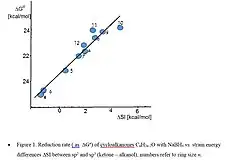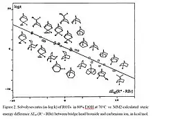 According to the VSEPR theory of molecular bonding, the preferred geometry of a molecule is that in which both bonding and non-bonding electrons are as far apart as possible. In molecules, it is quite common for these angles to be somewhat compressed or expanded compared to their optimal value. This strain is referred to as angle strain, or Baeyer strain.[9] The simplest examples of angle strain are small cycloalkanes such as cyclopropane and cyclobutane, which are discussed below. Furthermore, there is often eclipsing or Pitzer strain in cyclic systems. These and possible transannular interactions were summarized early by H.C. Brown as internal strain, or I-Strain.[10] Molecular mechanics or force field approaches allow to calculate such strain contributions, which then can be correlated e.g. with reaction rates or equilibria. Many reactions of alicyclic compounds, including equilibria, redox and solvolysis reactions, which all are characterized by transition between sp2 and sp3 state at the reaction center, correlate with corresponding strain energy differences SI (sp2 -sp3).[11] The data reflect mainly the unfavourable vicinal angles in medium rings, as illustrated by the severe increase of ketone reduction rates with increasing SI (Figure 1). Another example is the solvolysis of bridgehead tosylates with steric energy differences between corresponding bromide derivatives (sp3) and the carbenium ion as sp2- model for the transition state.[12] (Figure 2)