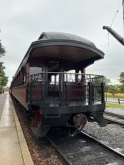 The railroad operates the United States' only operational wooden dining car on which visitors may dine while riding. Attractions at the station include the fully operational 15 in (381 mm) gauge Pint-Sized Pufferbelly[17] (Cagney steam-powered ridable miniature railway), a vintage pump car and several c.1930s "cranky cars", along with several gift shops and a cafe.