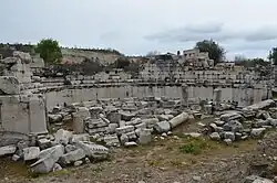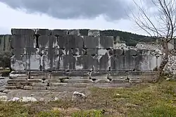 Southeast of the gymnasium stands a well-preserved bouleuterion (previously thought to be a temple of Serapis), measuring c. 25 x 30 m, with semicircular rows of seats and a courtyard to the east. It has been variously dated to the 1st or 2nd century AD.[11][22]: 291-292 The north wall of the building is covered with Greek and Latin inscriptions, including a partial Latin text of Diocletian's price edict,[23][24] and a Greek mnemonic poem listing the months of the year and attributed to Menippus, the orator from Stratoniceia praised by Cicero.[11][22]: 291-292