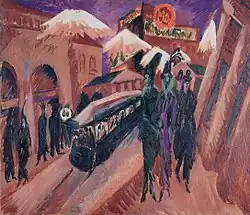 The street scenes are a series of works by the German artist Ernst Ludwig Kirchner made between 1913 and 1915. The cycle is regarded as one of the most important works of German expressionism. It consists of 11 paintings, 32 pages from sketchbooks, 15 ink brush drawings, 17 pastel and chalk drawings, 14 woodcuts, 14 etchings and 8 lithographs. The series deals with the Berlin of the early 20th century and its development into a metropolis. The works frequently depict "Koketten" (prostitutes), who serve as a metaphor for the hectic pace and sensuality of the growing city.