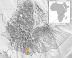 This species is endemic to central-southern Ethiopia.[10] It lives in a small area circumscribed by the towns of Yabelo, Borena, Mega, and Arero in Sidamo Province, and settles in wildlife under protection within Yabelo Wildlife Sanctuary and Borana National Park.[6] Its total range covers about 2,400 square kilometers (930 sq mi).[6]