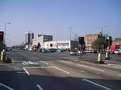 Stretford's built environment developed along the A56 road in two separate sections, corresponding to the original two manors. The area in the south, near to the border with Sale, grew around the church of St Matthew – an old alternative name for the town was Stretford St. Matthew.[56] The northern part of Stretford was centred on Old Trafford, with undeveloped countryside separating them. During the 19th century, the sections merged.[57]