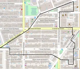 The Strivers' Section Historic District is in the north end of Dupont Circle, a historic district and neighborhood in the northwest quadrant of Washington, D.C. The boundaries of the historic district are roughly Swann Street and the Dupont Circle Historic District on the south, Florida Avenue and the Washington Heights Historic District on the north and west, and the Sixteenth Street Historic District on the east. In addition to Florida Avenue, major roads that pass through the district are 17th Street, 18th Street, New Hampshire Avenue, and U Street.[2][3]
