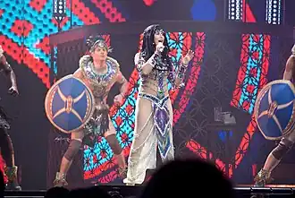 Cher performing "Strong Enough" at her 2014 Dressed to Kill Tour during a gladiator-themed segment of the show.