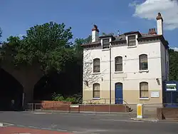Stroud Green railway station is a former station in the Stroud Green area of north London. It was located between Finsbury Park station and Crouch End station on a bridge over Stapleton Hall Road. The station had platforms (now demolished) cantilevered from the bridge structure and a wooden station building (also now demolished) at ground level under and on either side of the bridge, with a station master's house to the north of it. The bridge still exists and now carries the Parkland Walk cycle and pedestrian path, whilst the station master's house serves as a community centre.[1][2]
