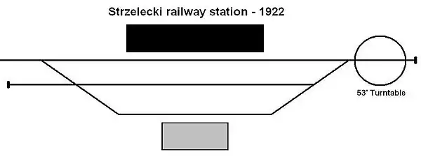 Strzelecki was the only station on the line to be fitted with a 53-foot (16 m) turntable. Gangers' facilities at the station were a headquarters, tool shed and departmental residence. Goods facilities included a goods loading platform, goods shed and cattle and sheep yards. Motorised maintenance trolleys were also kept at the station.[1]: 40–44