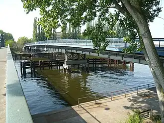 In addition to the historic Stubenrauchbrücke, which has been a listed building since the 1980s,[8] the Berlin Senate, which has been responsible for all of Berlin since the fall of the Wall, had a parallel reinforced concrete beam bridge built 20 meters downstream from the Spree in the early 1990s, which served as a makeshift construction for traffic between Ober- and Niederschöneweide. However, in 1994, both bridges had to be closed to truck traffic. Between 1998 and 1999, extensive repairs were carried out on the Stubenrauch Bridge. These renovations were funded by the Joint Task for Improvement of the Regional Economic Structure and the European Regional Development Fund, with a total cost of 12.5 million marks (equivalent to about 9.5 million euros in today's currency).[9] Engineers from the firm Gregull + Spang were responsible for the project, which included reinforcing the metal structure by installing an orthotropic deck and replacing corroded metal components of the main opening.[10] On the south side of the bridge, a new concrete arch was added to match the design of the northern bridge arch, based on historical plans. Additionally, several historic-style streetlights were installed in the middle section of the bridge.[11]