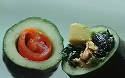 Many different dishes incorporating stuffed cucumber exist. In Korean cuisine, oi sobaegi is a kimchi made from stuffed cucumber filled with onions, shrimp, ginger, garlic and chili.[1] In Nevşehir, Turkey, ripe cucumbers are dried in the sun, then stuffed with bulghur seasoned with dill, mint, tomato paste and onion.[2]