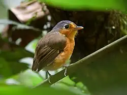 "Grallaricula are very small Andean antpittas, found mostly in low dense vegetation (such as treefall gaps, stream edges, and bamboo thickets)."[4] The Sucre antpitta is about 10 to 11 cm (3.9 to 4.3 in) long. The sexes have the same plumage. Adults of the nominate subspecies have an orange rufous loral spot and a buffy to buffy-rufous eyering. Their crown and nape are dark slaty gray. Their upperparts and tail are dark olive brown and their wings slightly browner with thin buff edges on the primaries. Their ear coverts, sides of their neck, and their throat are bright rufous orange. Their lower throat and upper chest have a thin white or rufous-washed white band with a wide band of rufous orange across their chest. That color continues along the sides of their chest and their flanks. The center of their chest and their belly are white. Subspecies G. c. pariae has a somewhat purer olive brown upperparts than the nominate but is otherwise the same. Both subspecies have a brown iris, a black bill with a whitish or pale base to the mandible, and gray legs and feet.[5][6]
