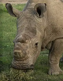 Sudan (1973 – 19 March 2018) was a captive northern white rhinoceros (Ceratotherium simum cottoni) that lived at the Safari Park Dvůr Králové in the Czech Republic from 1975[3] to 2009 and the rest of his life at the Ol Pejeta Conservancy in Laikipia, Kenya.[4] At the time of his death, he was one of only three living northern white rhinoceroses in the world, and the last known male of his subspecies. Sudan was euthanised on 19 March 2018, after suffering from "age-related complications".[5]