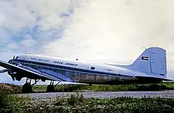 Kassala and Asmara were removed from the airline's list of destinations in 1952. In February that year, a fifth Dove was phased in. There was such a demand for flying that the toilets on the Doves were removed to make room for more seats, with these aircraft even carrying passengers in the cockpit. This prompted the airline to look for newer and bigger airliners, with the Douglas DC-3 and the de Havilland Heron being under consideration.[4] Flown with Austers and Doves, by March 1953 the carrier was operating a domestic network that was 4,800 kilometres (3,000 mi) long.[6] That year, the carrier incorporated the first four DC-3s into the fleet.[4] The boost in capacity allowed the company to carry both passengers and mail, to introduce new regular routes to Cairo and Wad Medani,[5]: 91 and to carry out aerial survey tasks for the government.[4] Also in 1953, the Chadian city of Abeche was made part of the route network, whereas regular flights to Jeddah were launched in June 1954.[7] Services to Athens commenced in the mid-1950s. Two more DC-3s were bought in 1956.[7] In 1958, after taking office, the Supreme Council of the Armed Forces decided to expand the carrier's international operations.[5]: 91 A seventh DC-3 was incorporated into the fleet that year.[7] Long-haul services started in June 1959 between Khartoum and London via Rome –the so-called "Blue Nile" service[8]– using a Viscount 831 that was acquired new earlier that year in a joint venture with British United Airways.[5]: 91 Beirut was added to the destination network in November the same year.[7] Also in 1959, the airline joined IATA.[9]