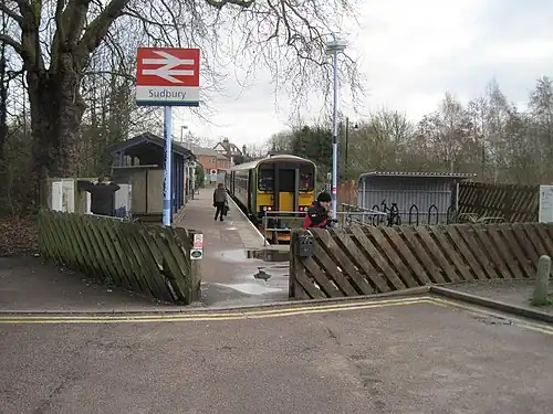 Sudbury railway station is the northern terminus of the Gainsborough Line, a branch off the Great Eastern Main Line in the East of England, serving the town of Sudbury, Suffolk. It is 11 miles 67 chains (19.05 km) down the line from the southern terminus of Marks Tey and 58 miles 32 chains (93.99 km) measured from London Liverpool Street; the preceding station on the branch is Bures. Its three-letter station code is SUY. The platform has an operational length for two-coach trains.[1]
