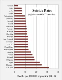 Greece is not considered a major suicidal country. Greece was the country with the lowest suicide rate in Europe according to a research done by WHO in 2012.[1] Greek suicide rates are also among the lowest in the world, a fact that is attributed to various factors, such as the mentality of the Greek society and the climate of the country.