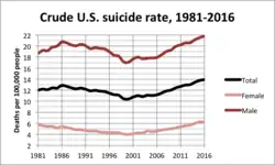 - ^ "Data Brief 241: Increase in Suicide in the United States, 1999–2014 : Data table for Figure 1. Age-adjusted suicide rates, by sex: United States, 1999–2014" (PDF). Centers for Disease Control and Prevention. Retrieved November 9, 2017.