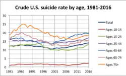 In 2015, suicide was the seventh leading cause of death for males and the 14th leading cause of death for females.[20] It was the second leading cause of death for young people aged 10 to 34.[21] From 1999 to 2010, the suicide rate among Americans aged 35 to 64 increased nearly 30 percent. The largest increases were among women aged 60 to 64, with rates rising 60 percent, then men in their fifties, with rates rising nearly 50 percent.[22] In 2008, it was observed that U.S. suicide rates, particularly among middle-aged white women, had increased, although the causes were unclear.[23] As of 2018, about 1.7 percent of all deaths were suicides.[2]